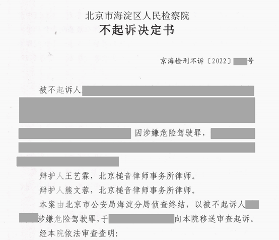 北京槌音律师事务所王艺霖律师、熊文蓉律师为某起涉嫌危险驾驶罪案件提供辩护,并通过精准辩护,取得不起诉结果。